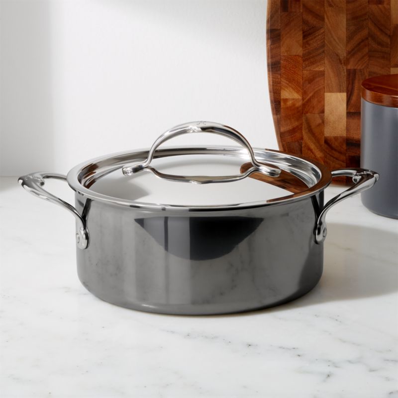 Harder than steel and 100% toxin-free, this hard-working sauté pan offers exceptional heat conduction so you can cook like a pro. Heat tolerant to over 1,000°F, this pot is a natural for searing ingredients for flavorful soups and stews. You can even use it to bake casseroles, mac and cheese, and scalloped potatoes. The science behind the pot's NanoBond technology unites micro-layers of titanium with stainless steel in a chemical-free and environmentally friendly process to create a stain- and scratch-resistant surface with brilliant luster. This lighter weight pot features a flared rim for easy pouring and graceful ergonomic handles.
