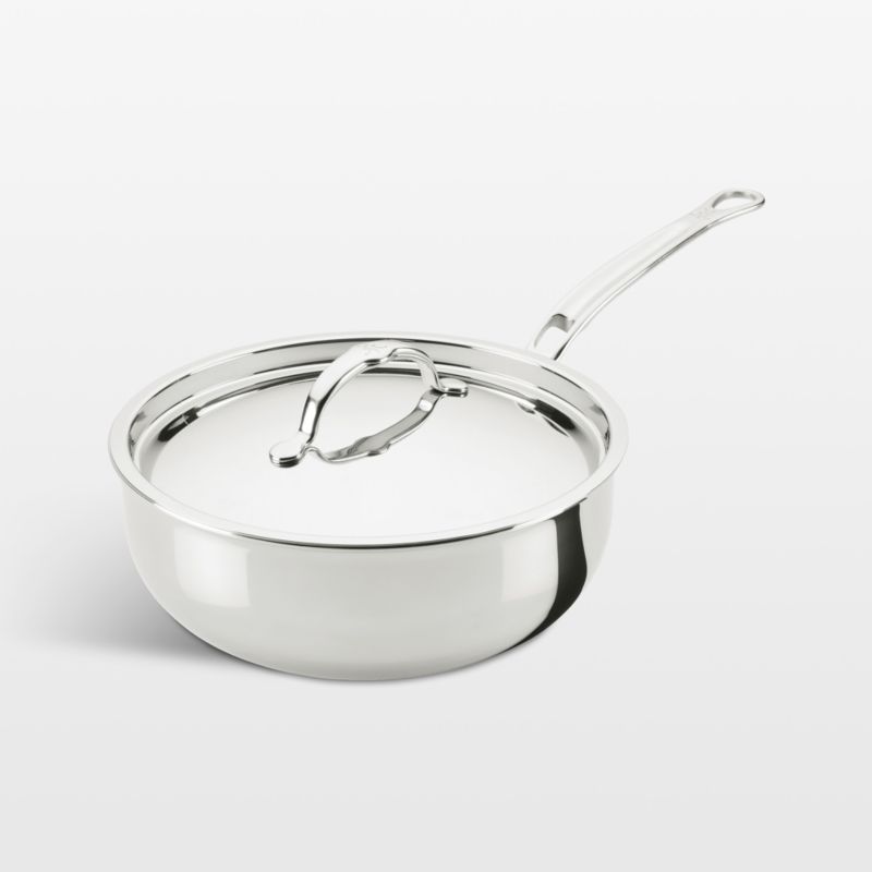 This mirror-polished essential pan gleams on the stovetop. The tri-ply construction sandwiches exceptionally conductive aluminum between two layers of durable stainless steel for impeccable sauteing, simmering and more. A stay-cool, seamless handle thoughtfully designed by chef Thomas Keller is joined to the lidded pan with flush rivets for easy cleanup. Crafted in Italy with a luxurious look and professional performance, this all-purpose pan braises meat, sautes vegetables and stews sauces on any type of stovetop and cleans quickly in the dishwasher.