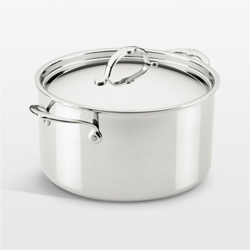 This mirror-polished stainless steel stockpot gleams on the stovetop. The tri-ply pan sandwiches an exceptional conductive aluminum core between two layers of durable stainless steel for impeccable browning, simmering and stewing. A thick flared rim pours without drips, and the handles join the lidded pan with flush rivets for easy cleanup. Crafted in Italy for a luxurious look and professional performance, this oven-safe stockpot works with any type of stovetop and cleans quickly in the dishwasher.