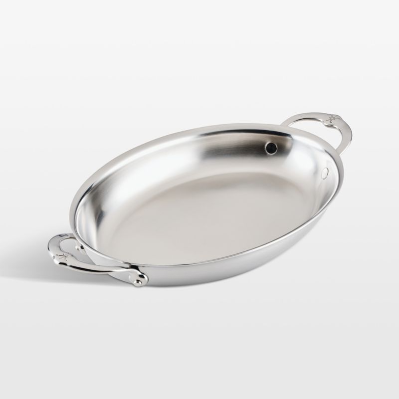 This mirror-polished stainless steel pan gleams on the stovetop—and the table. The tri-ply au gratin dish sandwiches an exceptional conductive aluminum core between two layers of durable stainless steel for impeccable sauteing, browning and baking. A thick flared rim pours without drips, and the stay-cool, seamless handles thoughtfully designed by chef Thomas Keller join the low pan with flush rivets for easy cleanup. Crafted in Italy for a luxurious look and professional performance, this oven-safe pan works with any type of stovetop and cleans quickly in the dishwasher.