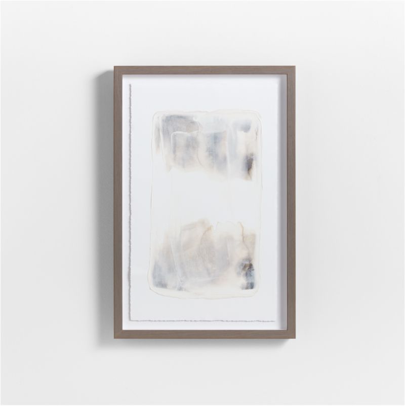 Emulating the filmy appearance of wax-based encaustic works, our Hidden Gems II print layers semi-translucent paste on paper. Applied with a wide spatula, broad strokes of the paste veil underlying printed and paint-enhanced brown and grey shapes for a neutral, nuanced and textured appearance. This exclusive glicée print with hand-finishing is presented in a taupe wood frame under glass.