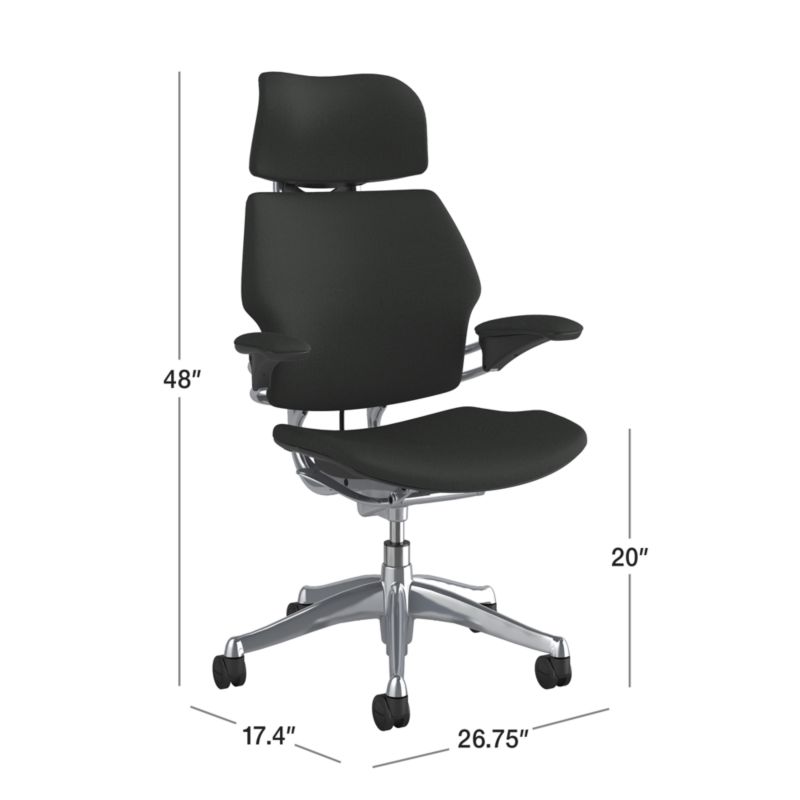 An office chair that works with you as you're working from home. Created by Humanscale, the blue Freedom chair adjusts to you as you move throughout the workday. The unique self-locking reclining mechanism uses your body weight to adjust automatically, leaning up to 20 degrees, and the pivoting backrest tilts as you do. The articulating headrest supports your neck and head as you recline, and the armrests stay with you as you do. Curving invitingly, the "waterfall" seat edge reduces force on the back of knees and allows for even weight distribution, and pressure-relieving foam cushions provide a comfortable sit. The polished aluminum frame with blue high-performance fabric brings a sleek, modern look to your workspace.