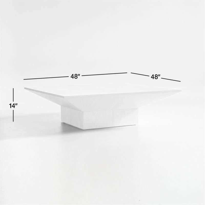 Our Icon coffee table cuts a dashing figure with dramatic angles and a contemporary silhouette. A monolithic pedestal base floats an expansive top with exaggerated reverse bevel. Made of pine veneer, the table is given a white wash finish that lightens the look and lets the wood's natural tones show through to play up the dynamic cathedral graining. This striking square wood coffee table is a Crate & Barrel exclusive.