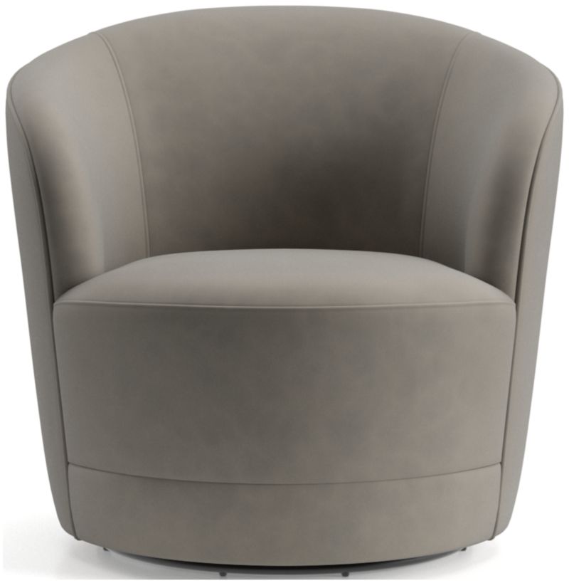 Channeling 1930s Hollywood, Infiniti shows off its glamorous curves in a super-durable fabric that captures the luxurious look and feel of soft, heathered chenille. Enjoy the cozy embrace of Infiniti's semi-circular tight back and snug cushion. Plus, the chair's swivel feature lets you follow the action without leaving your seat. The Infiniti Swivel Chair is a Crate and Barrel exclusive.
