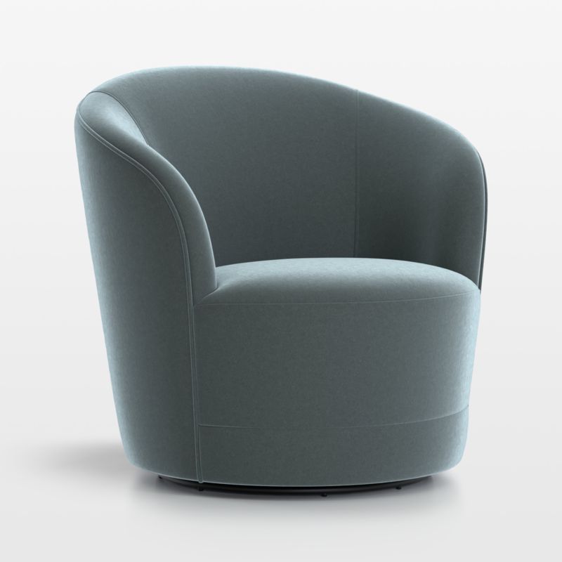 Channeling 1930s Hollywood, Infiniti embraces with glamorous curves and lush velvet. Infiniti's semi-circular tight back and snug cushion makes a cozy embrace, while the chair's swivel feature lets you follow the action without leaving your seat. Tailored in surprisingly durable velvet, the fabric has a shorter pile to lessen tracking and give it an amazing hand. The Infiniti Swivel Chair is a Crate and Barrel exclusive.