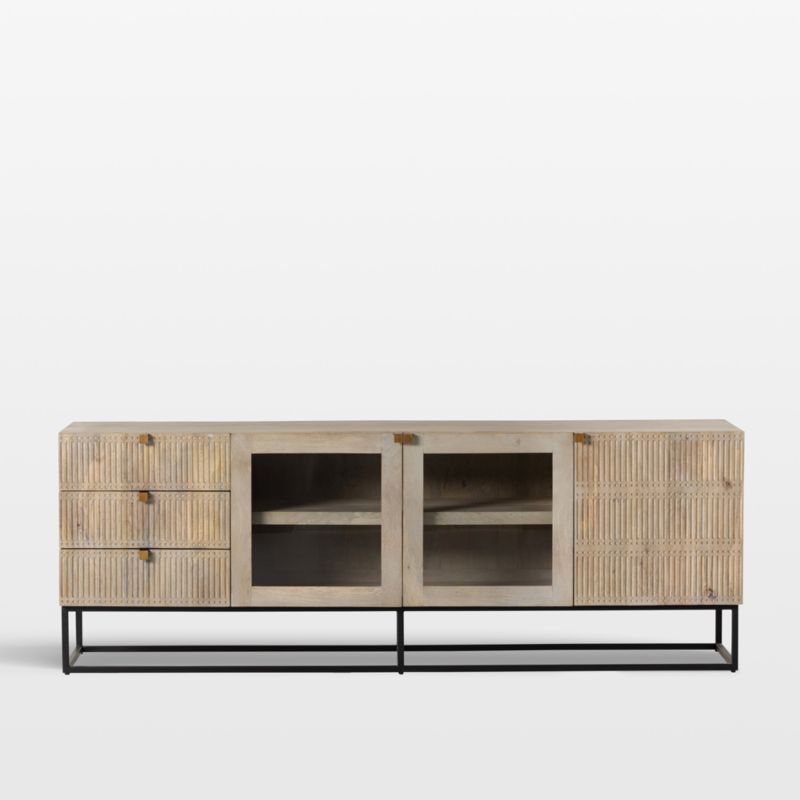 Distinguished by artisan-like carving, this finely crafted console reinterprets media storage with a global-meets-industrial attitude. Elevated on an airy cage of slim black iron, the media console provides lots of storage options with three drawers, an open cabinet with double glass doors and a single closed cabinet. Square iron pulls punctuate with a warm burnished brass finish. Crafted of renewable solid mango wood, from trees no longer producing fruit, the media cabinet is finished with a natural wash and offers plenty of space for audio/visual equipment, books and favorite decorative objects.
