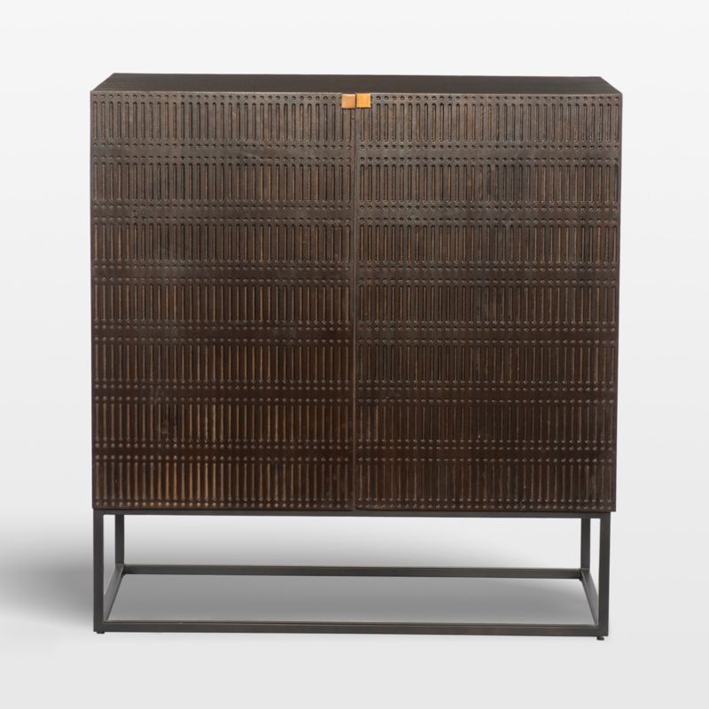 Distinguished by rustic dot and dash carvings, this finely crafted mango wood bar reinterprets bar storage with a global-meets-industrial attitude. Elevated on an airy cage of slim black iron, the bar features a double-doored cabinet that opens to two wine racks and four cubbies to store glasses, bottles and bar tools. Square iron pulls punctuate with the warm look of burnished brass, and a vintage brown finish adds depth to the textured woodworking.