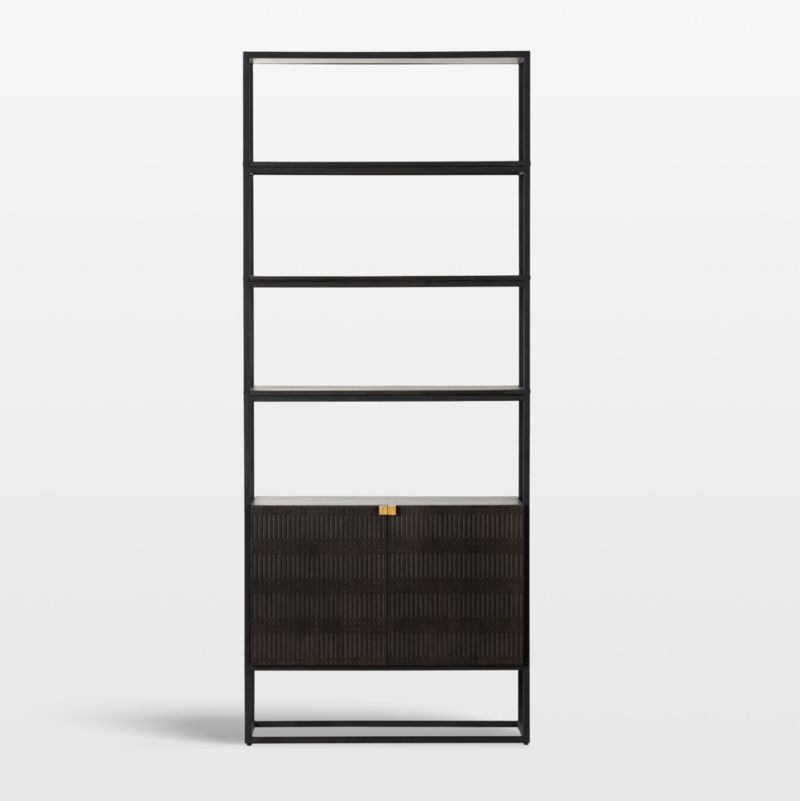 Distinguished by a cabinet with rustic dot and dash carvings, this finely crafted mango bookcase reinterprets household storage with a global-meets-industrial attitude. Outlined by an airy black iron frame, the bookcase features a double-doored cabinet topped with three open shelves. The cabinet's square iron pulls punctuate with the warm look of burnished brass, and a vintage brown finish adds depth to the textured woodworking.
