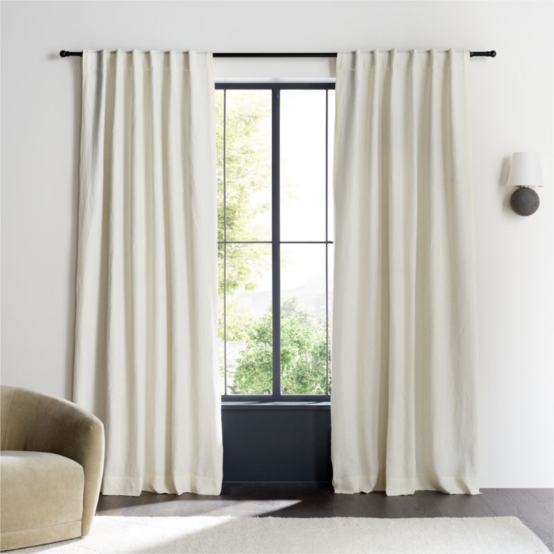 Sustainable linen weaves a luxurious blackout curtain in serene ivory. Washed for enhanced softness, the curtain panel drapes beautifully while blocking unwanted illumination from outdoors. Hang our exclusive linen curtain with blackout liner from the back tabs for an elegant pleated style, use the rod pocket to create a more laid-back gathered look or add a set of our curtain clips (sold separately).