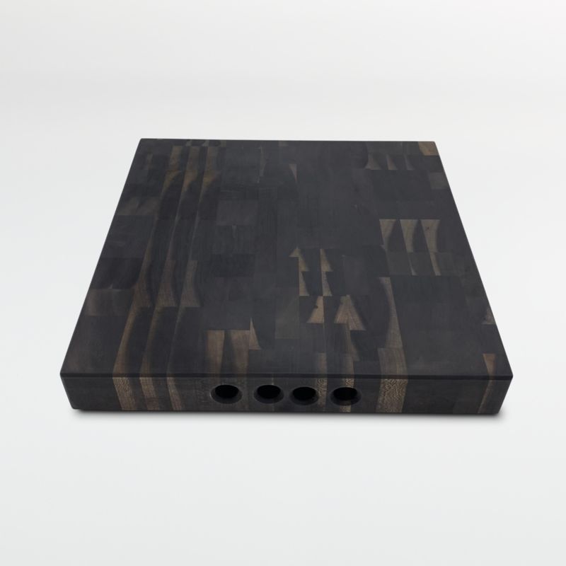Blackened cherry wood shapes a cutting and serving board with dramatic beauty. Treated with vinegar and steel wool to create a chemical reaction in the wood, the end-grain cherry board takes on a deep black color with subtle variations. The board is ideal for chopping vegetables and slicing bread, with finger holes on the sides that make it easy to pass crudités and crostini at cocktail hour. Beautifully finished in teak oil, the stunning cutting board makes a fabulous housewarming or wedding gift.