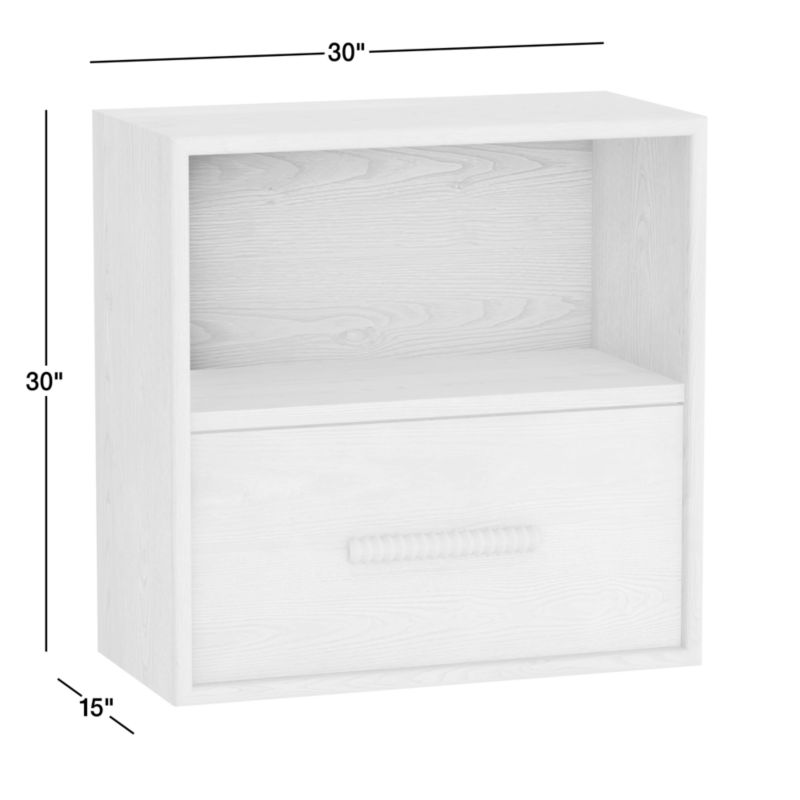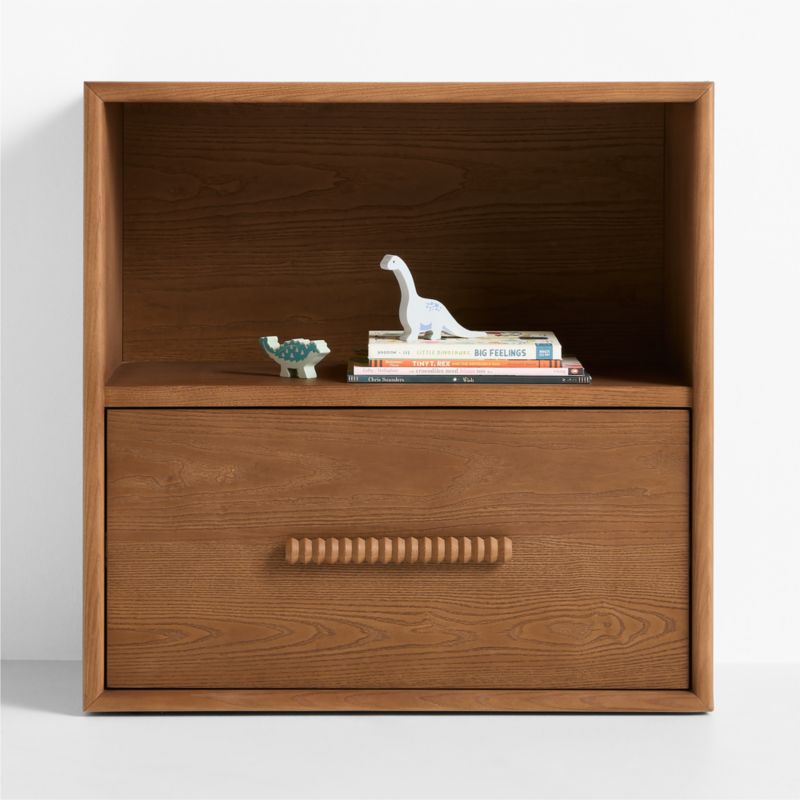 Our Jack modular bookcase with drawer is an ultra-functional piece designed to last throughout childhood and beyond. Crafted of solid ash wood in a rich hazelnut finish, it has an open shelf for displaying favorite objects, plus a roomy drawer with a whimsical spindle drawer handle. Pair it with other pieces from our heirloom-quality Jack collection to create a fully coordinated, infinitely adaptable kids' space.