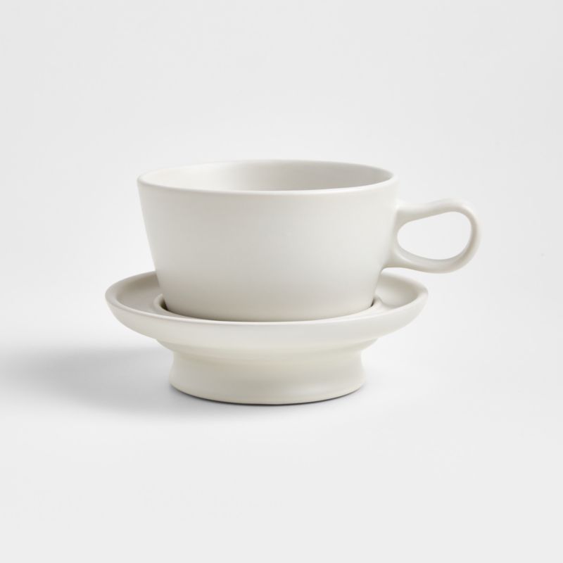 Flip, stack, serve and feast. Artist James Lewis designed this versatile dinnerware collection just for us, inspired by handmade pieces from his California studio. Elevated on a pedestal base for a classical look and comfortable handhold, the saucer cradles the cup or flips over to serve as its lid. Glazed creamy white, the set is ideal for an elegant after-dinner latte or morning tea. The ingenious saucer also doubles as a lid for the Jamesware cereal bowl or side dish, and as a pedestal or trivet for all the other gorgeous pieces from our modular, small-batch ceramics collection.