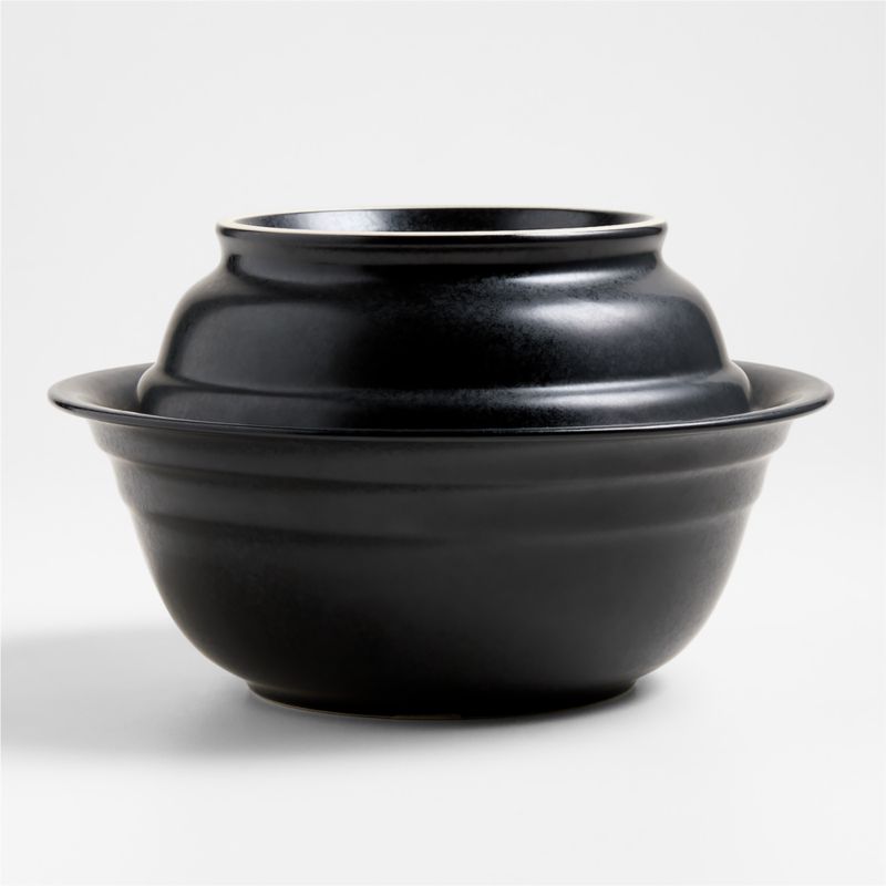 Flip, stack, serve and feast. Inspired by handmade pieces from his California studio, artist James Lewis designed this versatile dinnerware collection just for us. This ingenious set based on the Japanese donabe pairs two small-batch ceramic pieces glazed in charcoal black. Top the low bowl with the serving bowl to keep bread rolls, chicken wings or rice warm. Flipped over, the larger bowl serves soups, braised meats or hearty grain salads with the low bowl as a lid. Interior ridges and broad rims ensure the bowls fit together snugly. The Main Dish combines with other gorgeous pieces from our modular Jamesware collection to expand the stacking and serving possibilities.