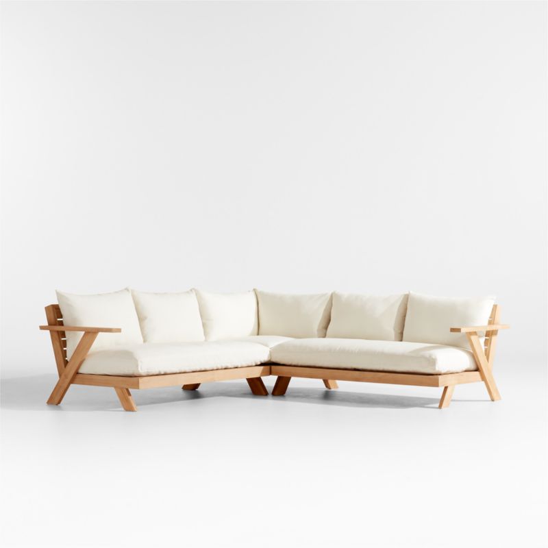 A sun-seeking ode to International Style architecture, our Jeannie outdoor sectional marries traditional craftsmanship with strong, geometric lines. A host of woodworking details and architectural elements—slatted back, mitered corners, cantilevered arms and angled legs—work together to give the sectional its carefree spirit and relaxed silhouette. Consisting of a corner chair flanked by left- and right-arm sofas, the three-piece sectional is a dreamy place to unwind with maximally plumped pillow backs and boxy bench seats covered in a stain- and fade-resistant white Inside Out performance fabric. Made of sustainably sourced teak, our Jeannie sectional weathers beautifully after a season or two in the sun.