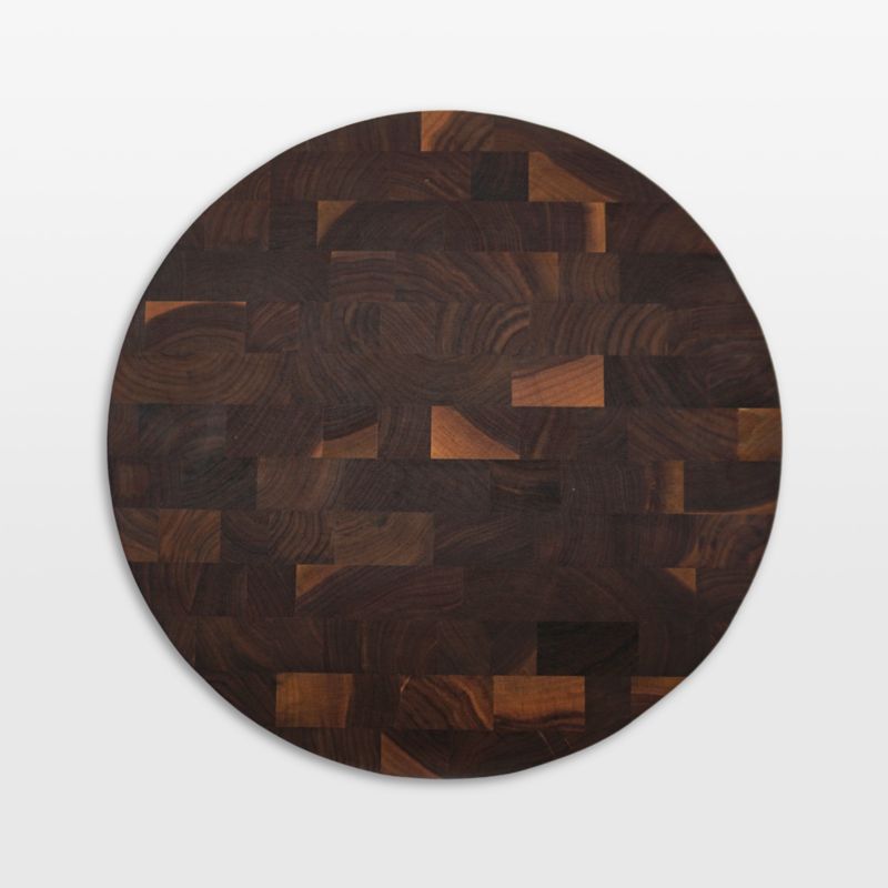 This display-worthy cutting board showcases the beauty of end-grain walnut wood. Made up of sections cut from the inner rings of a tree, the end-grain board boasts a dramatic mosaic of deep wood tones with warm highlights. The construction method is prized by professional chefs as it helps maintain the sharpness of knives. Handles carved into the side of the round board make it easy to lift from countertop to pot—or to pass as a cheese board around a dinner table or party.
