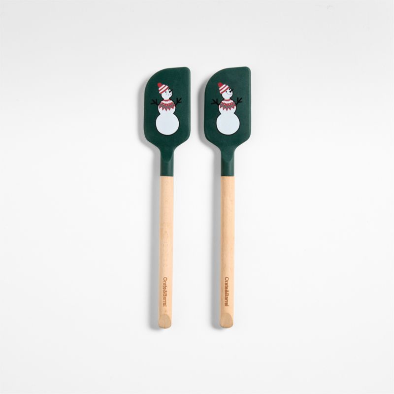 Bundled up for the holidays, Joan Anderson's delightful snowmen pose against the pine-green backdrop of our mini spatulas. The snowy friends are illustrated in clean black lines, with red-striped stocking caps and Fair Isle sweaters adding festive pops of color. The heat-resistant silicone makes it easy to scrape bowls of pudding and stir up pans of hot chocolate and cranberry sauce. Fitted with handles crafted of sustainably sourced beechwood, the two mini spatulas make sweet and useful gifts stuffed in Christmas stockings or tied atop wrapped presents.