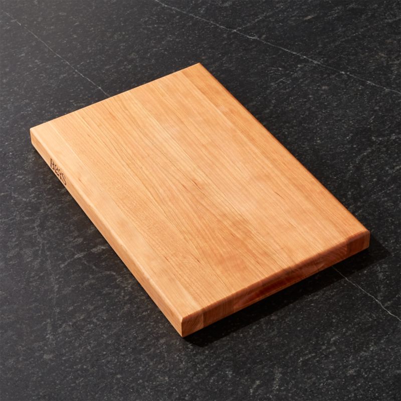This beautiful cherry cutting board is crafted by the revered woodworkers at John Boos, founded in 1887. The reversible board's edge-grain construction ensures uniform thickness and an even cutting surface. What's more the wood fibers absorb impact of cutting blades, allowing knives to stay sharper and the board smoother. Integrated hand grips make for a clean, streamlined look.