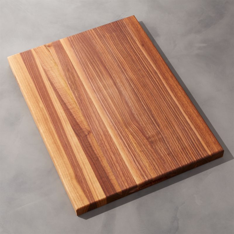 This beautiful cutting board is crafted out of black walnut by the revered woodworkers at John Boos, founded in 1887. The reversible board's edge-grain construction ensures uniform thickness and an even cutting surface. What's more the wood fibers absorb impact of cutting blades, allowing knives to stay sharper and the board smoother. Integrated hand grips make for a clean, streamlined look.