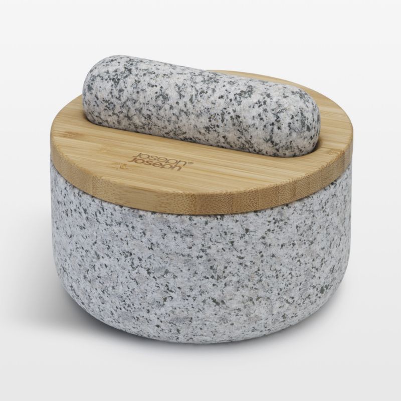 A new look for the traditional mortar and pestle, this cleverly designed version includes a dual-purpose lid. Made of bamboo, the lid keeps the mortar dust-free during storage and stores the pestle in a grooved recess. Flipped over, the lid serves as a mini chopping board. The heavyweight and hard-wearing pestle and mortar are carved from natural granite, the perfect substance for crushing vegetables, grinding spices, pounding herbs and making pesto and salsa.