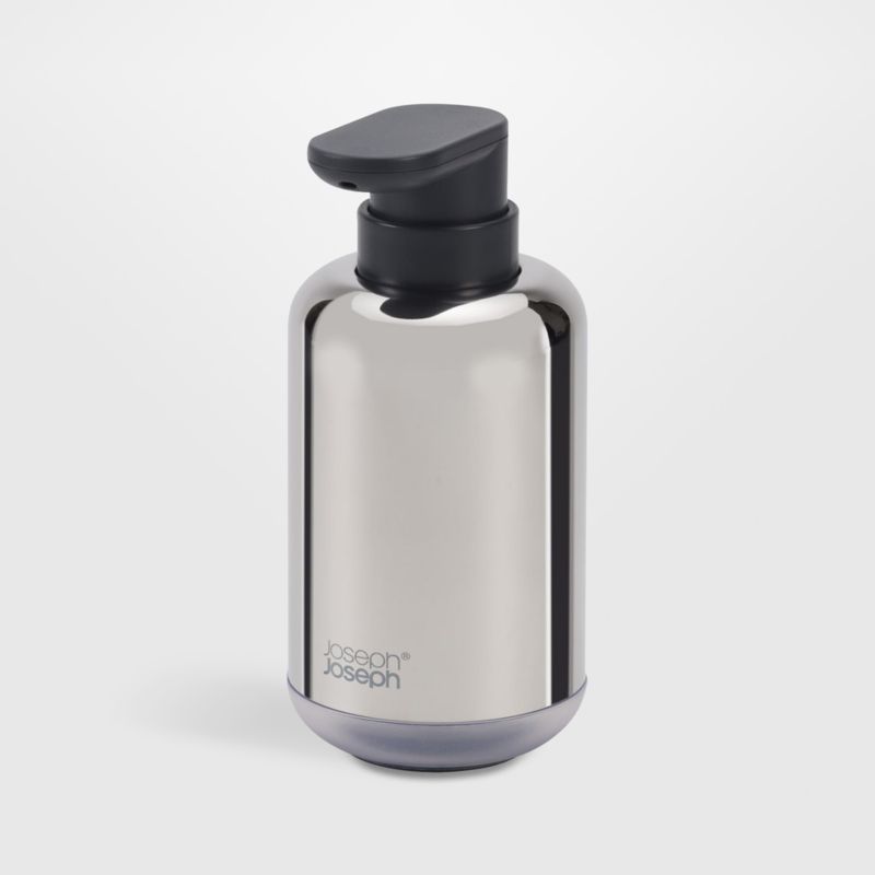 Dispense your favorite liquid soap from this display-worthy soap pump. Crafted of durable and attractive stainless steel with a reflective polished finish, the vessel looks modern on your kitchen sink or bathroom vanity. The black pump pushes down easily to dispense hand soap—the silicone base ensures no slipping—and the clear window lets you know when a refill is needed. Pair with our other sleek Joseph Joseph stainless steel accessories for a coordinated and orderly bathroom.