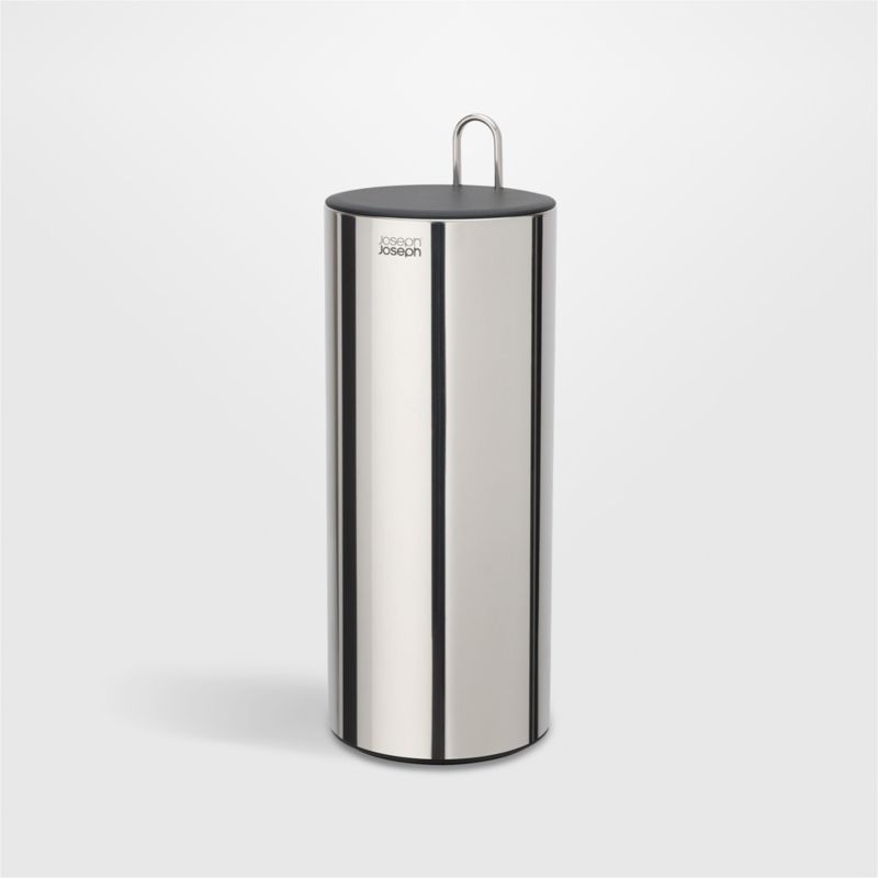 Keep plenty of rolls on hand with this modern toilet paper stand. Constructed of durable and attractive stainless steel with a polished finish, the freestanding holder suits your space. The black lid lifts easily thanks to its stainless steel finger hook, revealing up to three rolls stored discretely within. Especially perfect for powder rooms and guest baths so there's always plenty of paper available for visitors, the holder pairs with our other Joseph Joseph stainless steel accessories for a coordinated and orderly bathroom.