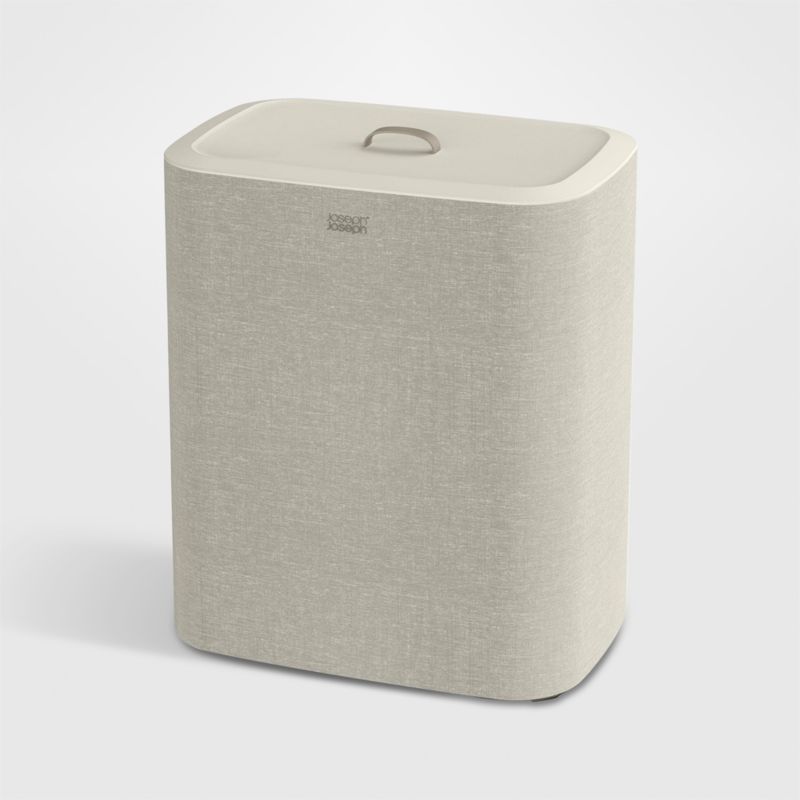 This triple laundry basket sorts and stores laundry in sleek style. With its handsome matte fabric exterior in heathered ecru, the sturdy bin opens to reveal three removable bags. Each one features carrying handles for easy toting to the washing machine, plus a clever handle on the base that makes it easy to empty out heavy loads. The bags attach to rims that make it possible to simply drop them back in the basket once empty. Topped with a coordinating lid with a loop handle, this handsome laundry basket is a must-have for a bedroom, bathroom, laundry room or dorm.