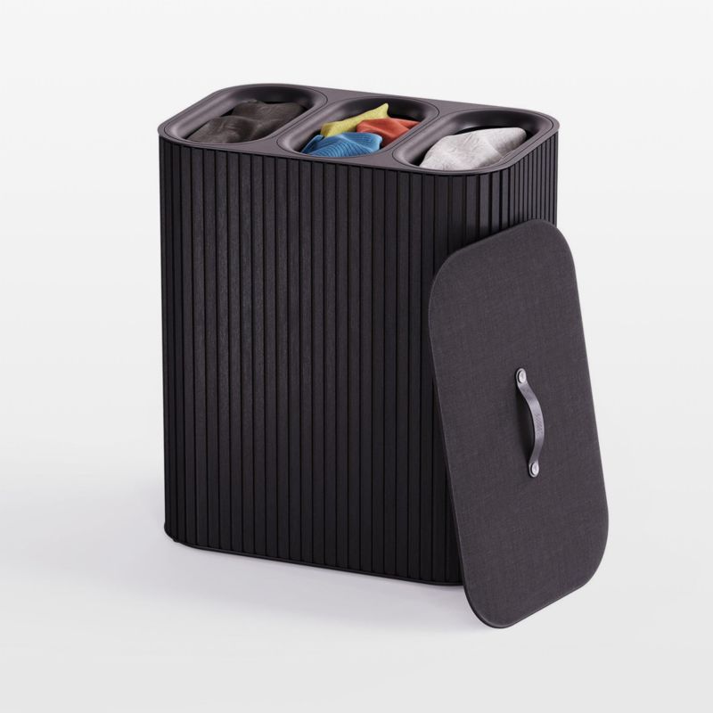 This triple laundry basket sorts and stores laundry in sleek style. Clad in slats of black-finished bamboo, the monochrome bin is topped with a matching fabric-wrapped lid with vegan leather handle. Inside three removable bags make it easy to sort lights, brights and darks or laundry to be washed in cold, medium and hot. Each bag features two carrying handles for easy toting to the washing machine, plus a clever handle on the base that makes it easy to empty out heavy loads. The bags attach to rims that make it possible to simply drop them back in the basket once empty. Display-worthy and utilitarian, this handsome laundry basket is a must-have for a bedroom, bathroom, laundry room or dorm.