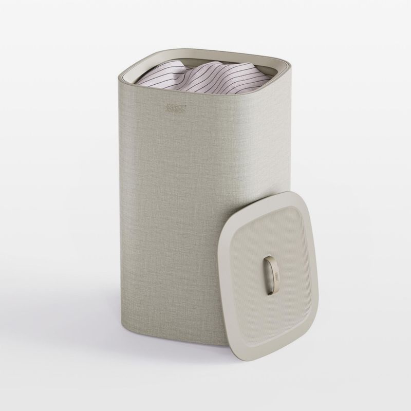 This accommodating laundry basket stores laundry in sleek style. Wrapped in heathered ecru fabric, the monochrome bin is topped with a matching handled lid. Inside a large removable bag ably handles bulky bedding and towels. Two carrying handles tote the bag to the washing machine, while a clever handle on the base makes it easy to empty out heavy loads. The machine-washable bag attaches to a rim that lets you simply drop it back in the basket once empty. Display-worthy and utilitarian, this handsome laundry basket is a must-have for a bedroom, bathroom, laundry room or dorm.