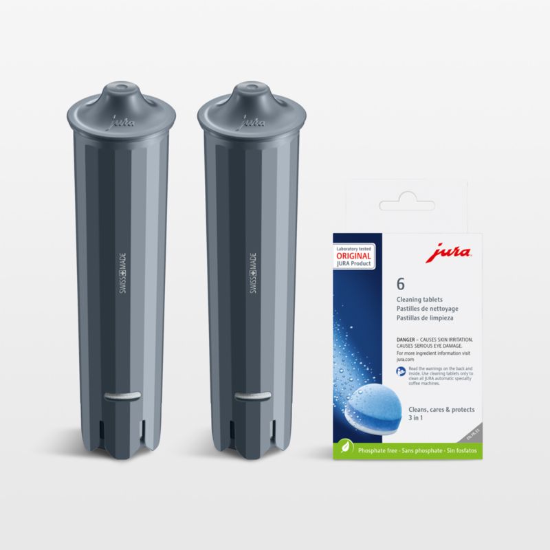 Ensure every cup you brew in your JURA coffee maker tastes impeccable with this set of CLEARYL water filters and cleaning tablets. Working in conjunction with your coffee maker's automatic cleaning system, the six tablets remove coffee oils, coat pipes to prevent oil buildup and protect against mineral deposits. The two filter cartridges maintain water purity while protecting the safety and hygiene of the machine by reducing limescale and maximizing cleanliness. CLEARYL filters exactly the amount of water required every time you brew coffee, and the water also flows continuously through the filtering capsules filled with natural active ingredients.
