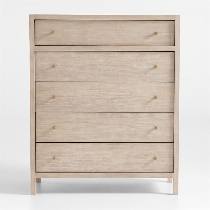 Refined and bold, Keane takes bedroom storage to the next level. Scaled to create a stately presence in the bedroom, each piece is crafted of beautiful mahogany and meranti woods with a natural finish. The chest stacks five drawers with inset panels and channel detailing to draw the eye to its clean, architectural lines. Round pulls dot the surface with a warm brass finish. Our best-selling Keane collection is a Crate & Barrel exclusive.