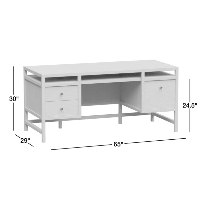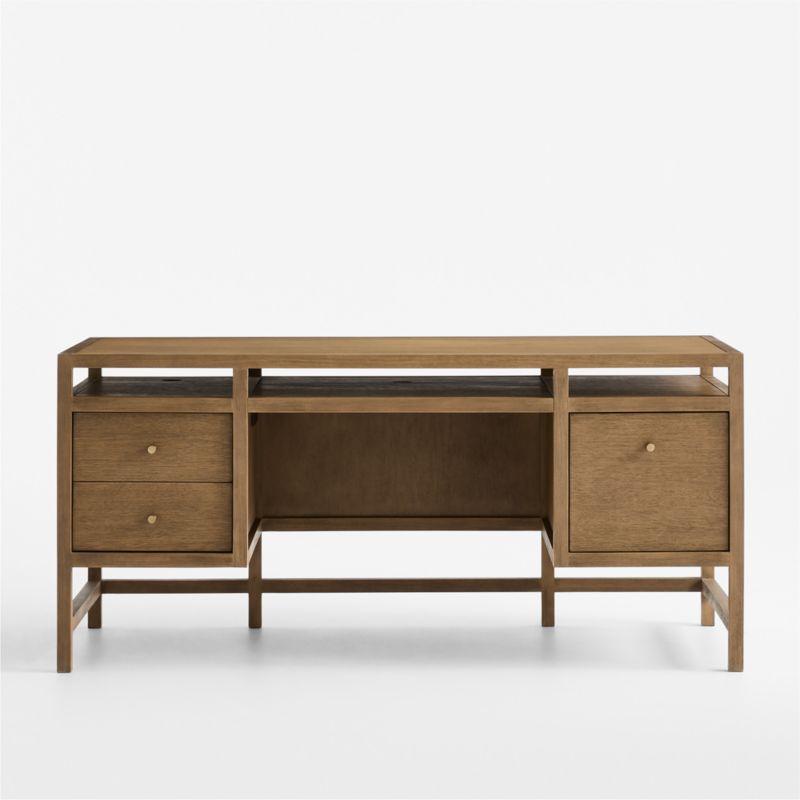 Our Keane desk takes a home office essential to the next level in beautiful solid mahogany. A driftwood finish puts the focus on the wood, while channel detailing and a mix of open and closed spaces create clean, architectural lines. An expansive top floats on the frame, creating three open cubbies with a pull-out keyboard tray in the center. An asymmetrical arrangement stacks two drawers on the left and a file drawer on the right. Integrated power completes this full-service home office desk.