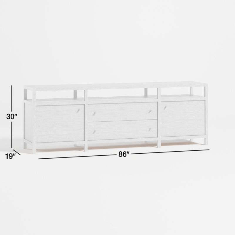 Refined and bold, Keane takes media storage to the next level. Scaled to create a stately presence in the living or family room, each console is crafted of beautiful meranti wood with a silhouette-enhancing black finish. The media console flanks a central set of drawers with roomy cabinets, all styled with flat fronts and dotted with small brass-finished pulls. Channel detailing on the sides complements the console's clean, architectural lines. Open shelving on top highlights media components, books or collectibles. Our bestselling Keane collection is a Crate & Barrel exclusive.