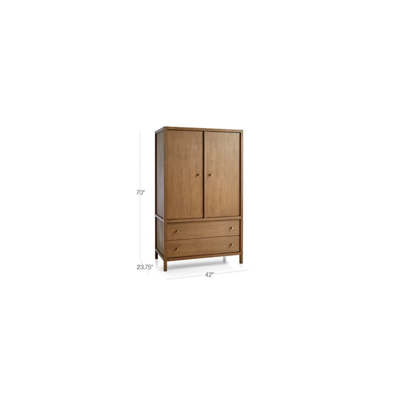 Refined and bold, Keane takes bedroom furniture beyond simple storage. Scaled to create a stately presence in the master bedroom, each piece is crafted of beautiful mahogany and given a grey-wash driftwood finish. The full-service wood armoire swings open to two adjustable shelves and a removable hanging bar. Hooks and ledges tidy up ties, jewelry and other small items for ready access. Two large bottom drawers are perfect for stowing blankets and extra bedding. Our best-selling Keane collection is a Crate & Barrel exclusive.