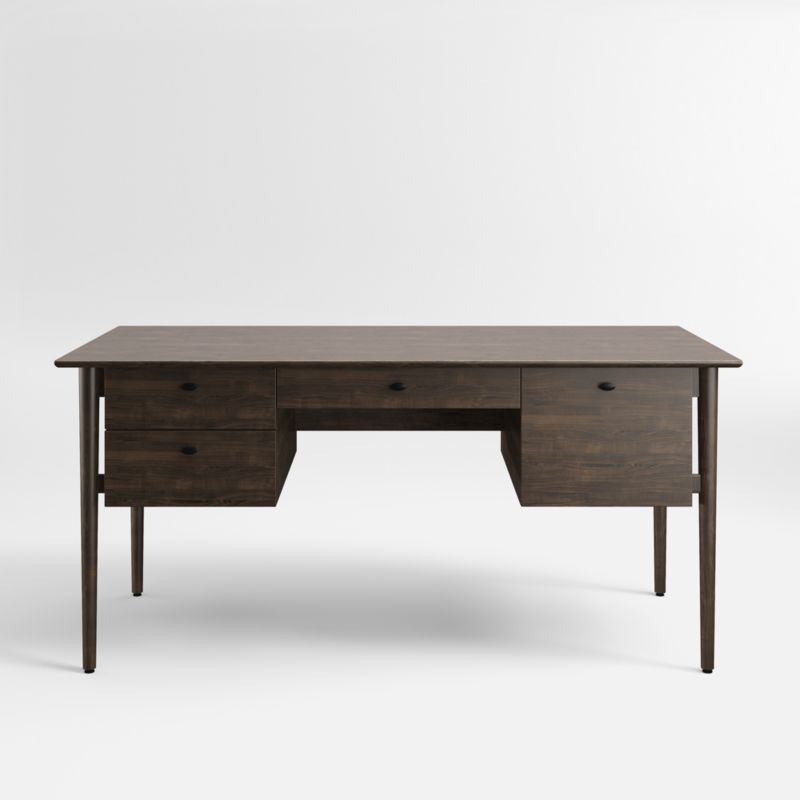 Kendall puts black cherry to work in a clean-lined desk that references classic mid-century details. Blake Tovin's architectural piece suspends a drawer sized for letter or legal files, a center drawer and two stacked storage drawers. Given a charcoal finish, the desk features simple round steel pulls matte black. The Kendall writing desk is a Crate and Barrel exclusive.
