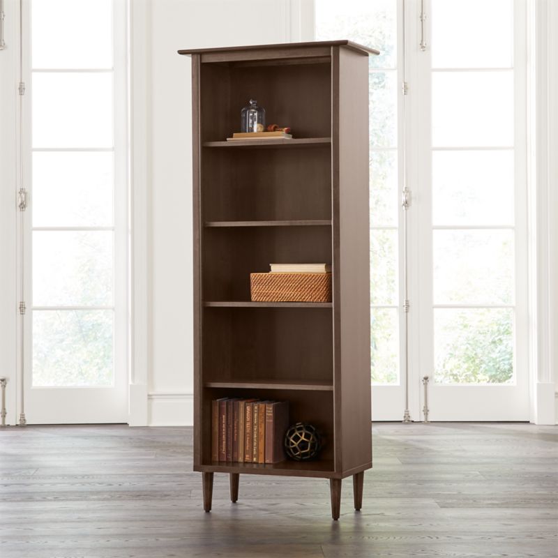 Solid maple and maple veneer finished in a warm cocoa brown to work in well-crafted bookcase with classic mid-century details. Blake Tovin's design rests atop slim yet sturdy legs with a hint of streamlined molding to offer book storage on four adjustable shelves. The Kendall Dark Mocha Bookcase is a Crate and Barrel exclusive.