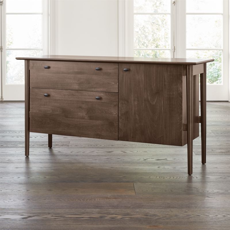 Finished in warm cocoa brown, this architectural credenza suspends a wide storage drawer, large file drawer and storage cubby between gracefully tapered legs. Designed by Blake Tovin of Tovin Design, the Kendall Cocoa Credenza is a Crate and Barrel exclusive.
