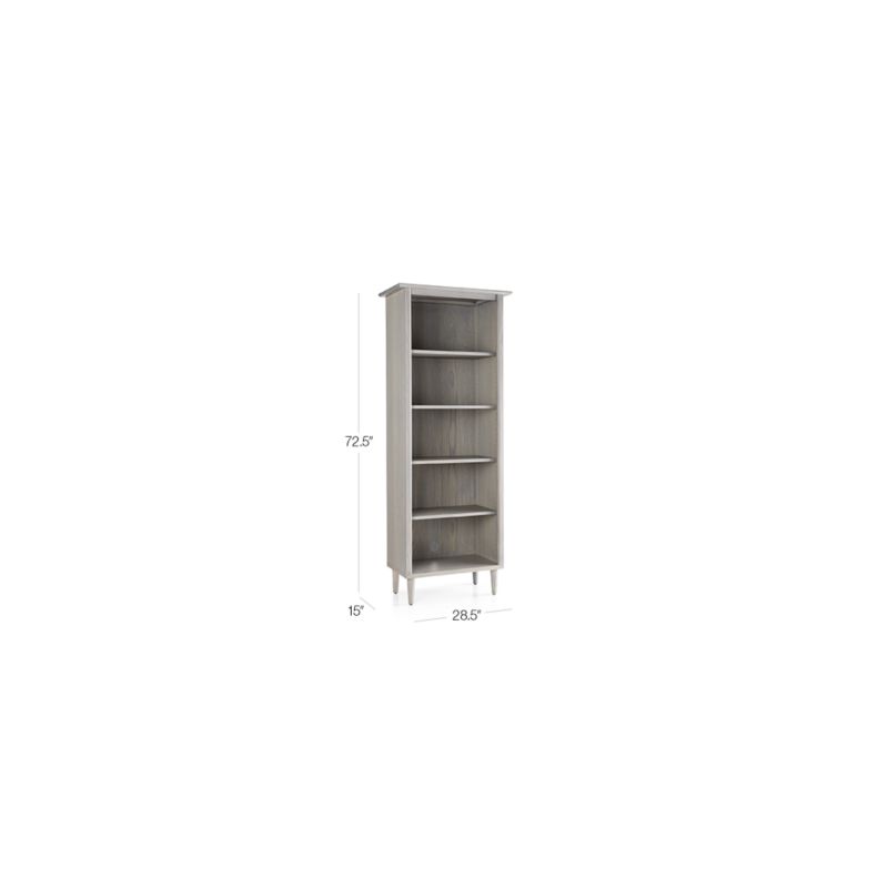 Finished in dove grey, this solid ash and ash veneer bookcase is crafted with classic mid-century details. Designed by Blake Tovin of Tovin Design, this bookcase rests atop slim yet sturdy legs with a hint of streamlined molding to offer book storage on four adjustable shelves. The Kendall Dove Bookcase is a Crate and Barrel exclusive.