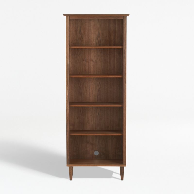 Blake Tovin's design rests atop slim yet sturdy legs with a hint of streamlined molding to offer book storage on four adjustable shelves. The Kendall Dark Mocha Bookcase is a Crate & Barrel exclusive.