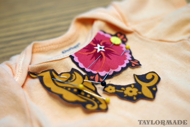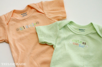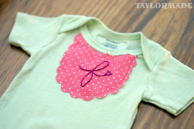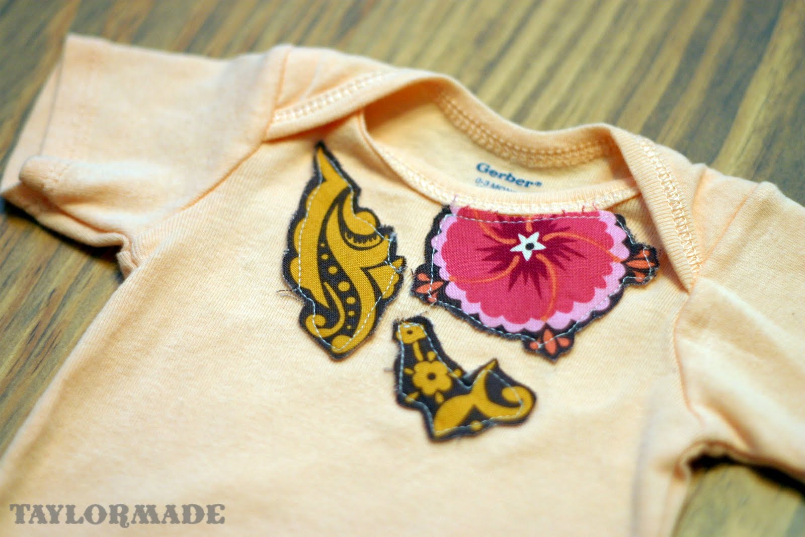 Babies need a little refashion sometimes too. These onesies were originally embroidered with a little "baby saying"… cute but I thought the colors were a little too girly for my Clyde. He never wore them, I refashioned and re-gifted! I just used some fabric scraps and some imagination.