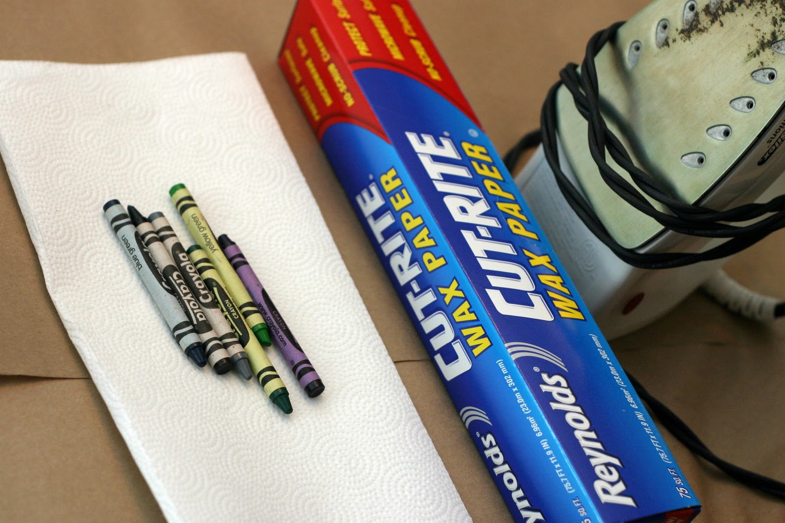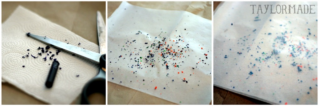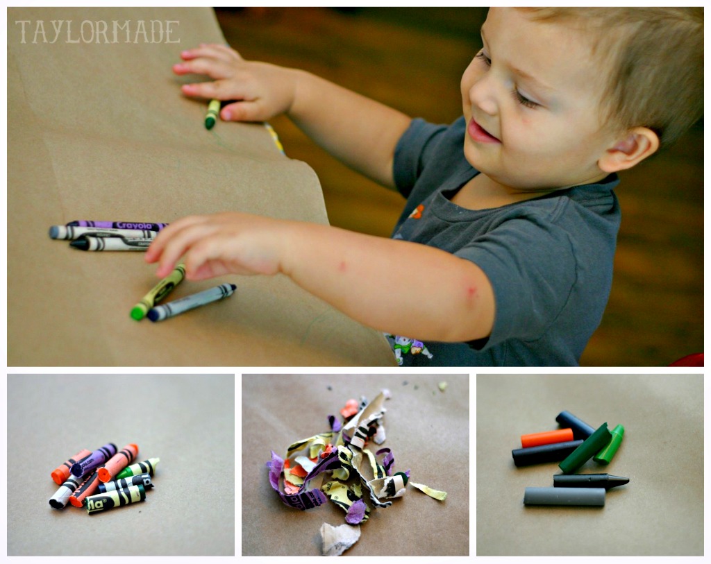 Use the scissors and make shavings from the crayons. Place the shavings on a piece of wax paper. Let the kids arrange the shavings and pick the colors. Then cover it with another piece of wax paper.