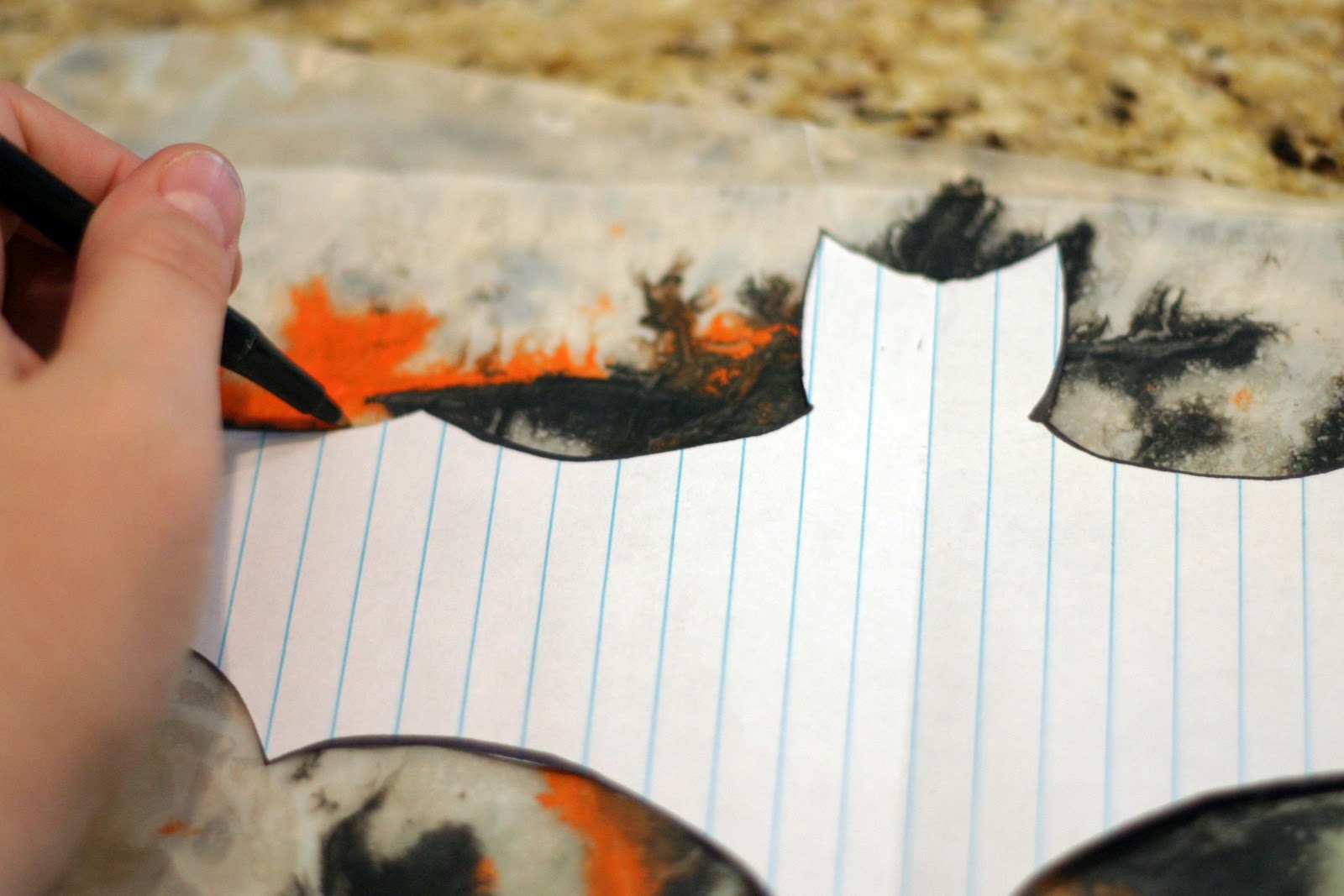 Are you in the Halloween spirit yet? Me either, could be because it is still in the high 90’s here in Texas. I usually look forward to the beginning of October because that is when I break out the Halloween Decor….It literally feels like the middle of summer 🙁 In hopes of feeling fall-ish, I turned to my trusty craft supplies. I remember doing this craft when I was little and making “stained glass”. Martha makes Valentines Hearts this way too. But today friends we are making Bats, or according to my 2 yr old son- “Batmans”. This is a great craft to do with the kids, actually- if my “active, just turned two, independent boy” can do it, then your dog can probably help you.