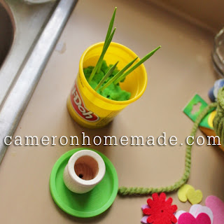 For some reason, I stopped taking pictures after this step. This is very unusual for me…and I apologize. Anyway, it's not too hard to explain without visual aids – I took two felt shapes, put a bit of hot glue between them, and carefully placed the "stem" skewers in the center. Then, we added a yarn bow or more felt shapes for "leaves." Finally, we took that worn out play dough and stuck a little in the pots, then topped it with glue and rainbow rice.