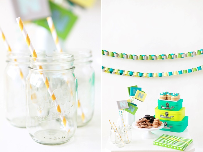 When planning Nate’s birthday party, I knew I wanted it to have a couple of handmade details and bright pops of color. I opted for a palette of turquoise, green, yellow and gray (the names of these colors on the Paper Source site are peacock, clover, sunshine and gravel). I crafted a couple of party elements—paper chains and flags with Nate’s first initial in washi tape. Since Nate adores cookies, it was easy to decide on the theme: milk and cookies. On the menu were a selection of delicious cookies and gorgeous “milk and cookie” fondant cupcakes made by the wonderful Candy Clay Cupcakes. Happy birthday, Nate! We are thankful for the blessing you are and your boundless energy and enthusiasm!