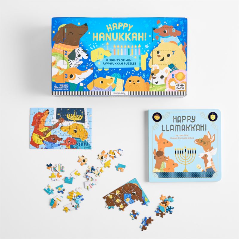 The Festival of Lights is even brighter with our giftable bundle. The Happy Hanukkah! Kids Countdown set includes eight mini puzzles depicting dogs engaged in "Paw-nukkah" activities like frying latkes and playing with dreidels. The "Happy Llamakkah!" book tells a captivating story of the holiday through a family of—you guessed it—llamas, with helpful explanations of the meaning behind Hanukkah traditions.