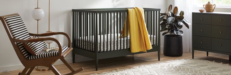 Going for a boho nursery theme? Accessorize your baby's room with furniture and decor that have an eclectic feel. For instance, a rattan bassinet brings texture to the space and adds an airy element. To continue the earthy theme, display planters with real or faux greenery inside, too. Then, put your quirky side on display with unique decor, such as animal-inspired wall art and garlands, as well unexpected light fixtures and patterned rugs. In addition to catching the eye, boho nursery furniture meets your storage needs. For instance, a dresser with chic hardware gives you a spot to store baby's pajamas, bedding and bibs. An assortment of plush toys displayed on its surface gives the baby room a welcoming feel.