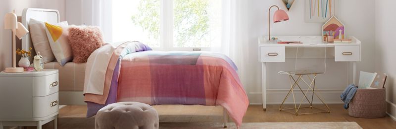 Completing the transition from toddler to big kid? Help put your little one's evolving personality on display with a glam bedroom. Versatile with a hint of maturity, this stylish theme helps create a space for your child to play and learn. To start out, select a twin bed that acts as the focal point of the room. Think one with a textured headboard and legs, or take a more practical approach with another that includes storage underneath. No matter their preference, bedding—fitted sheets, flat sheets and pillowcases included—in pastel colors helps enhance the aesthetic. A nearby nightstand provides convenient storage, and a dresser on the other side of the room helps keep their wardrobe organized as well. In the glam bedrooms of school-age children, don't forget to add a desk, complete with a coordinating chair and task lamp.