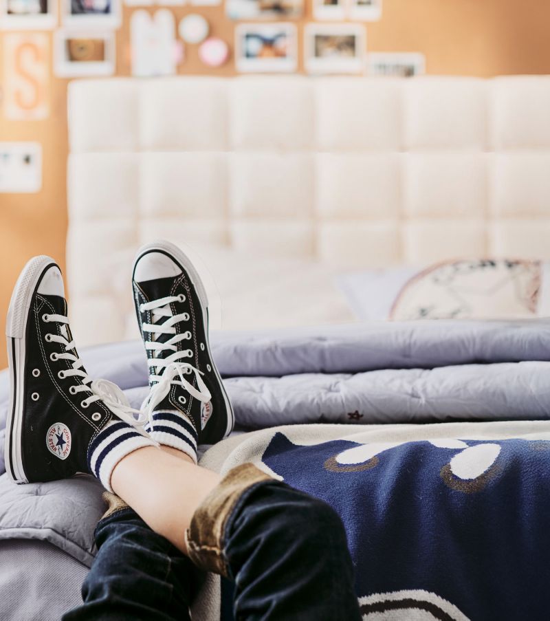 And it's not just about the bed. Complete the look with Converse-inspired decor that adds personality to every corner. Evocative throw pillows that have embroidered designs of legendary sneakers add a playful touch to reading nooks, while patterned rugs ground the room with confident, athletic energy. Whether shopping for a toddler transitioning to a big kid bed or a tween looking for an edge, Converse for Crate & Kids delivers a look that is effortlessly cool, comfortable and authentically them.