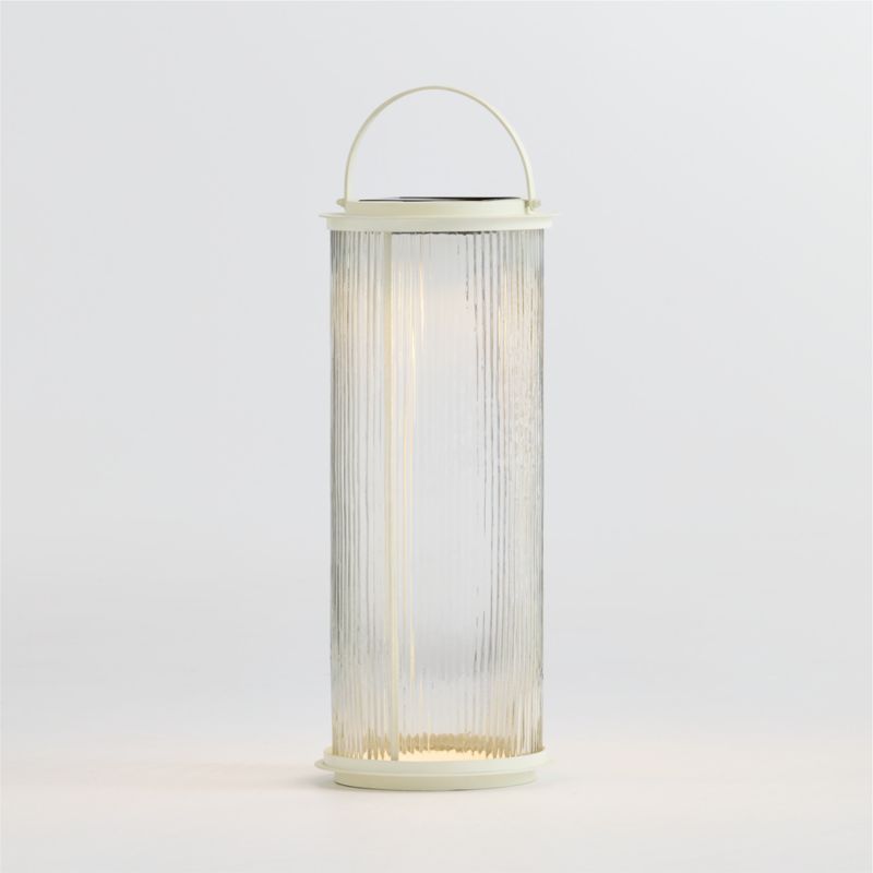 Our Kimball solar lantern glows from top to bottom. Crafted of fluted glass that ripples light, the lantern boasts a look that blends ultramodern style with vintage warmth. White-coated iron caps keep the look light. Kimball is topped with a discreet solar charging panel as well as a swivel handle that makes it easy to tote indoors and out.
