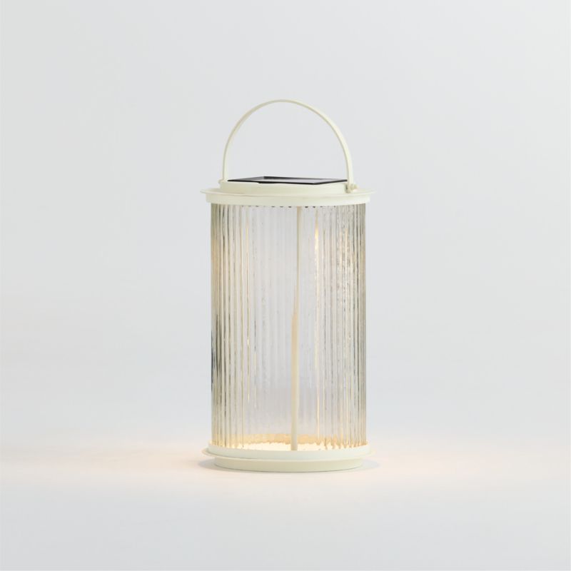 Our Kimball solar lantern glows from top to bottom. Crafted of fluted glass that ripples light, the lantern boasts a look that blends ultramodern style with vintage warmth. White-coated iron caps keep the look light. Kimball is topped with a discreet solar charging panel as well as a swivel handle that makes it easy to tote indoors and out.