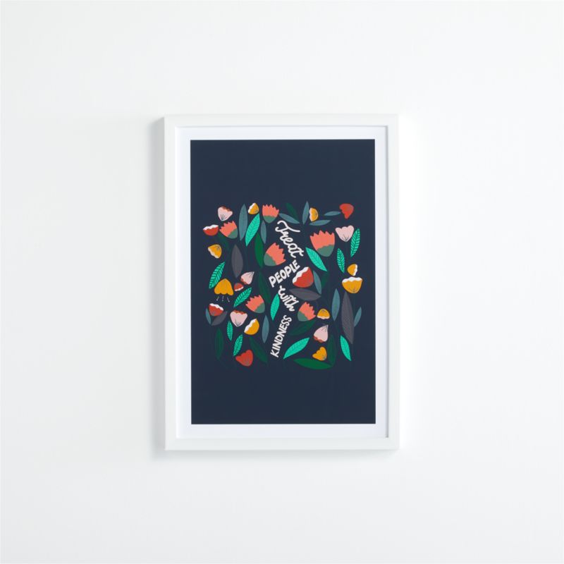 A lovely new take on the golden rule, this framed wall art reads, "treat people with kindness." The thoughtful text is surrounded by botanicals in vibrant colors on a slate-grey background. This giclée print by Oris Eddu is displayed under kid-friendly acrylic within a matte white frame.